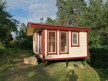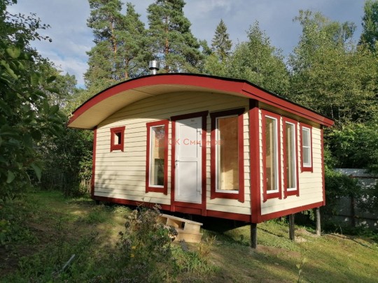 Авторские проект одноэтажной бани «Шале» с необычной округлой крышей, высокими панорамными окнами и небольшой террасой. Такую баню можно построить только из сухого или клееного профилированного бруса в комплектации под ключ. Из бруса естественной влажности и под усадку построить НЕВОЗМОЖНО.
