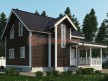 На фото представлен проект загородного дома №172 габаритами 7х7.5 метров и отличной планировкой общей площадью 126 квадратных метров. Можно выделить несколько особенностей проекта: терраса, эркер, панорамные окна. Особняк с мансардой, может использоваться как зимний, для постоянного проживания, коттедж.