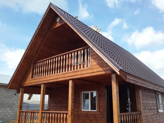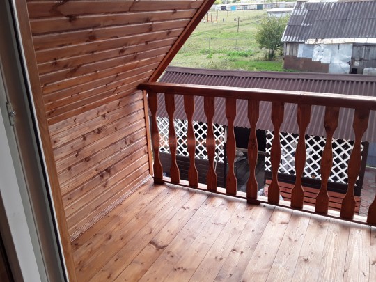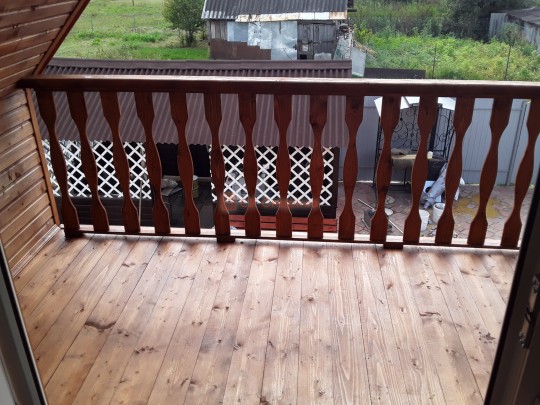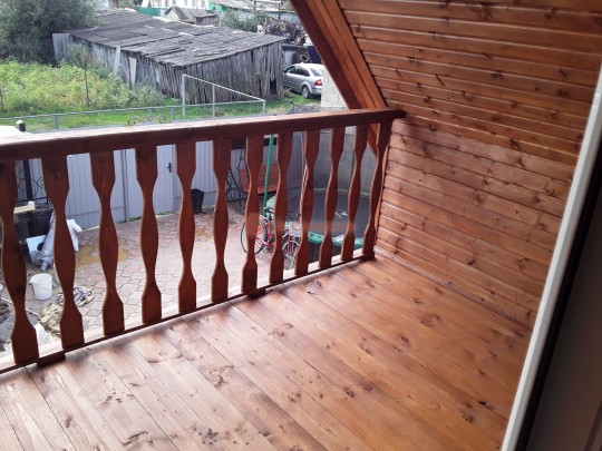 На террасе при условии что она есть делаем перила из строганной доски со всех сторон, столбы террасные также строганные, а не обрезки профилированного бруса с шипом и пазом. Домкратики на столбах для дальнейшей регулировки. Балясины будут сделаны аккуратно. Обратите внимание что в дешёвых случаях это может быть и будет просто вагонка прибирая к неотесанной доске снаружи и столбы будут не квадратные а просто профилированный брус как на видео.