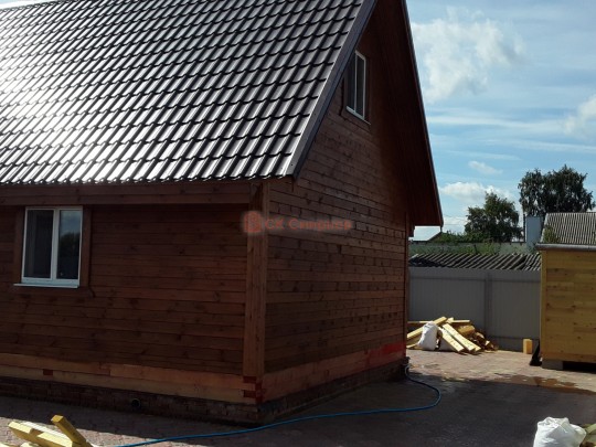 Из профилированного сухого бруса 9х14см, 14х14 см или 14х19 см. Сборка сруба в теплый угол на нагеля или гвозди 200 мм со сверлением отверстия в верхнем брусе (в зависимости от вида бруса).