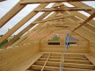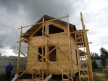 Главная проблема брусовых домов — усадка, после которой в срубе возникают щели в палец толщиной. Так случается, когда строят из дешёвого сырого бруса, плотно сажая венцы на гвозди (деревянные или металлические — без разницы). Мы же тратим время на сборку со сверлением. То есть сажаем брусья на металлические гвозди и в верхнем венце высверливаем отверстие под каждую шляпку. Поэтому во время усадки бруски не зависают на гвоздях, деформируя сруб, а свободно по ним скользят. Технология трудо- и времязатратная, но результат потрясающий — даже в срубах из сырого бруса практически нет щелей.